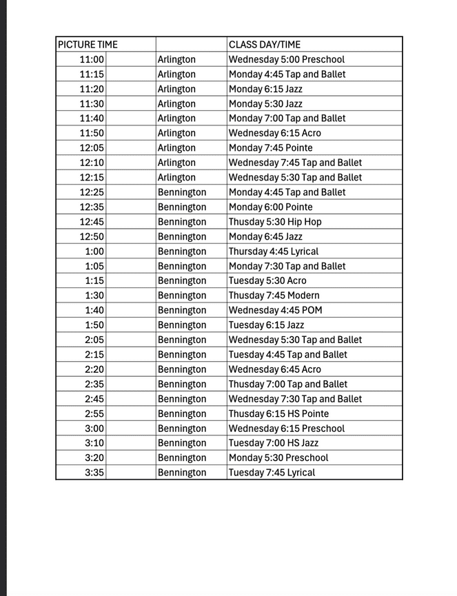 Look for your regular class day/time on the right. On the left will be your picture time. Combo Tap and Ballet classes will only take pictures in 1 costume. We will email you when we have more details on costume instructions!